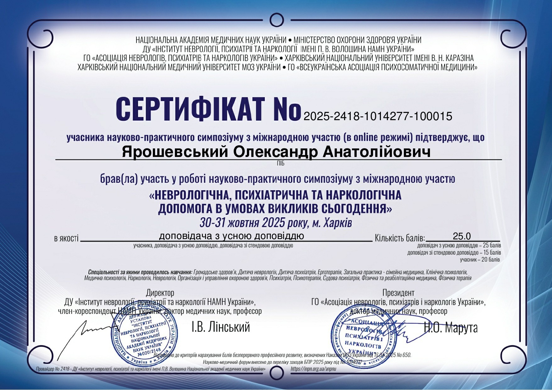 Кандидатська дисертація «Неврологічні аспекти міофасціальної больової дисфункції шийно-плечової локалізації» – 2005рік.